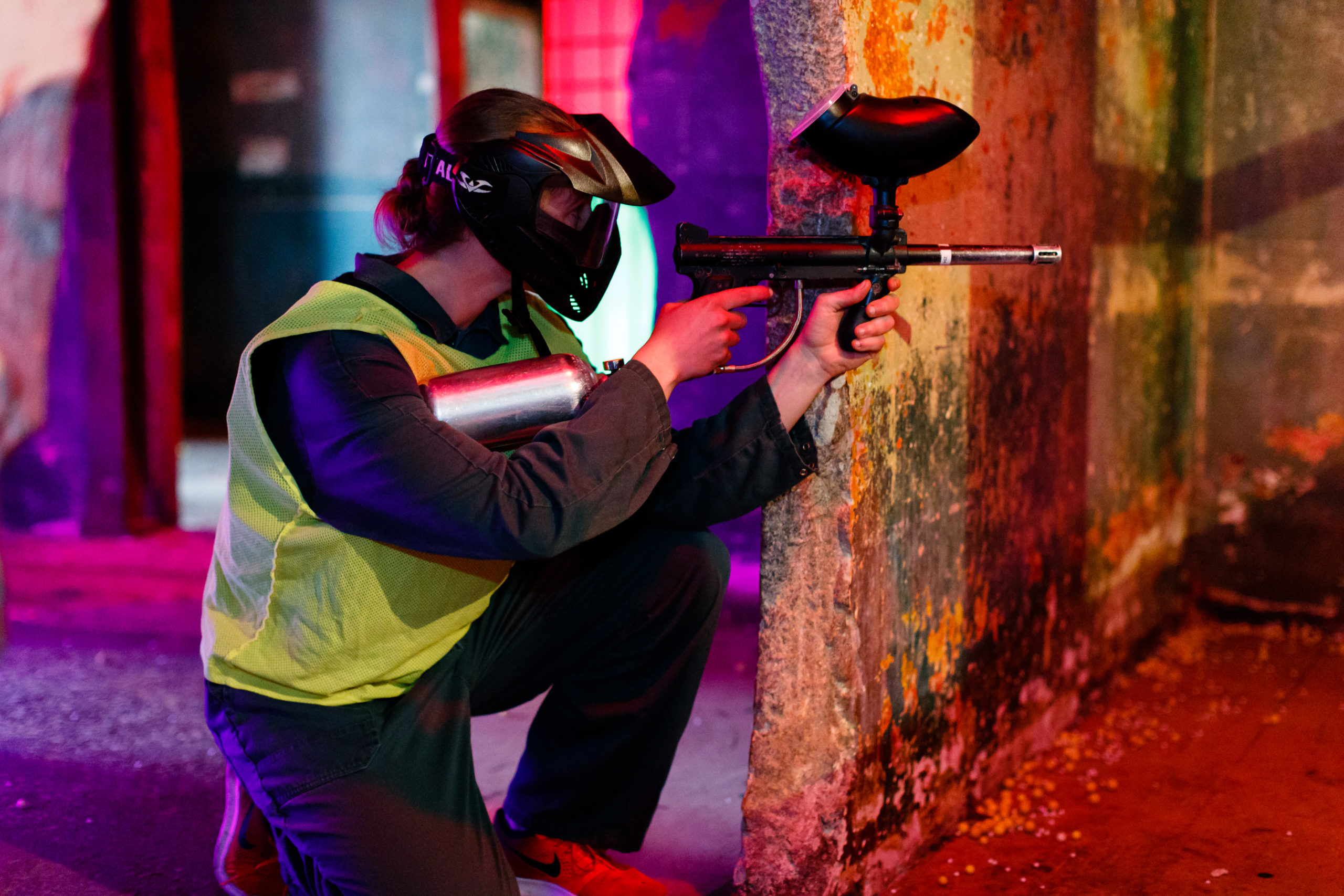 Tijdens het paintball spelen jullie met Tipmann 98 wapens. Daarnaast wordt er ook gespeeld met reballs (milieuvriendelijke balletjes) de nieuwste trend bij paintballen. Ons indoorveld bestaat uit twee speelvelden waar jullie verschillende uitdagende spellen in spelen. Van vlag veroveren tot het beschermen van de President.